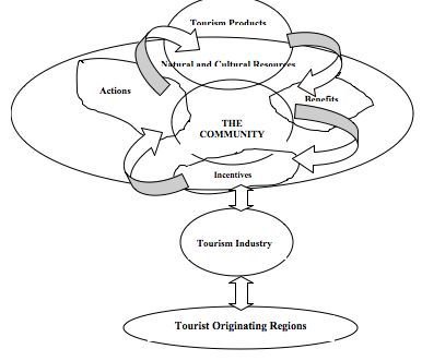 he key rationale underlying the approach and objectives of CBT for conservation and development is that CBT through increased intensities of participation can provide widespread economic and other benefits and decision-making power to communities. These economic benefits act as incentives for participants and the means to conserve the natural and cultural resources on which income generation depends. Note from the diagram that the community is at the centre and is occupying the commanding position with regard to the management of its natural and cultural resources which can be reformulated as tourism products. The relationship of the industry to the tourism products developed out of the natural and cultural resources of the community is not a direct, one-to-one relationship; on the contrary, it is through the intermediation of the community. This is aimed to ensure that the aspirations of the community are never bypassed by the extraneous industry interests. One can see CBT as an interaction among the three major groupings of the community, the tourism industry, and the tourists themselves. In the language of cost-benefit analysis (CBA), community based tourism may be expressed in terms of the following inequalities: